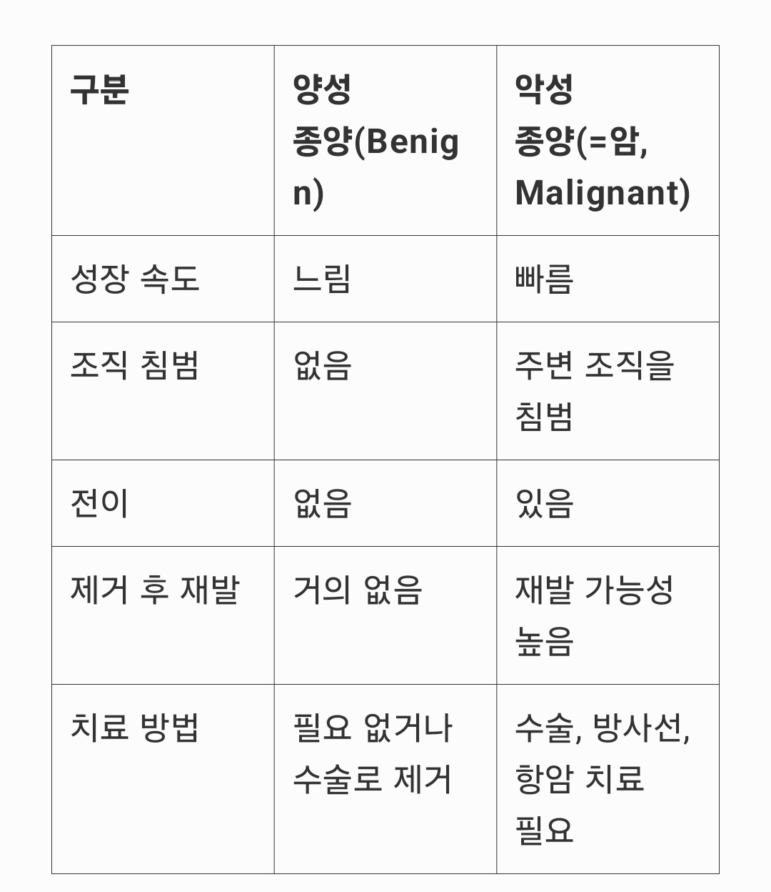 ➡ 결론: 종양이 항상 암은 아니지만, 악성 종양이라면 암입니다.