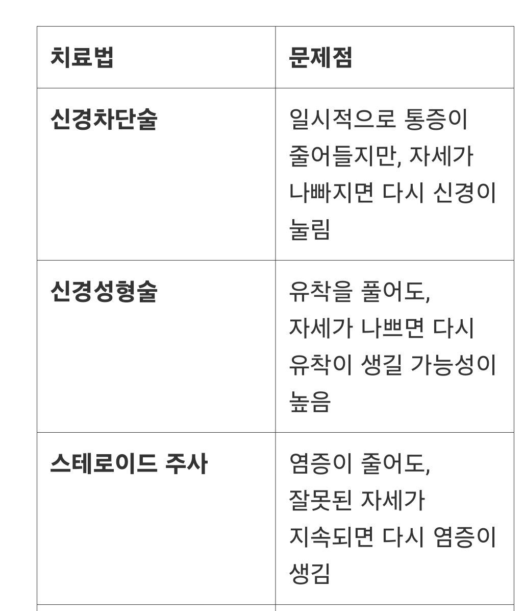 📌 많은 사람들이 병원 치료를 받지만, 바른 자세를 유지하지 않으면 다시 악화된다.