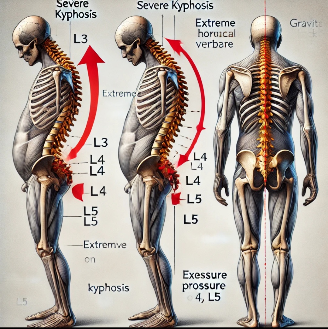 허리 굽힘(후만증), 골반 틀어짐 → 요추(L3~L5)에 과도한 하중이 집중됨