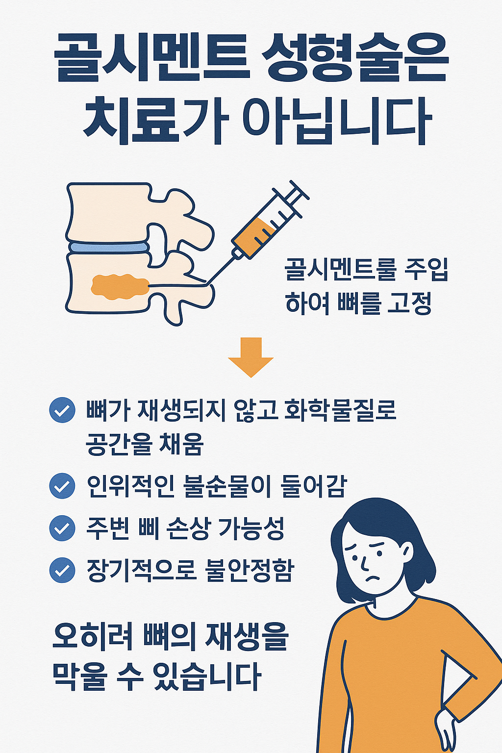 주입되는 시멘트는 우리 몸이 인식하는 이물질입니다. 생체적합성은 있지만, 생체재생 능력은 없습니다.