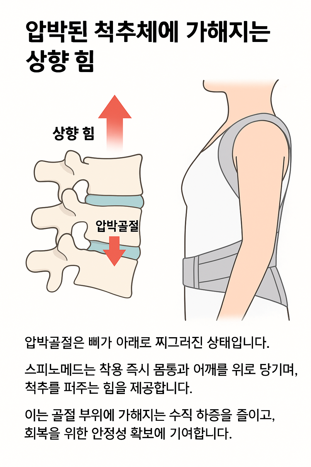척추를 위로 끌어당겨 굽어짐을 물리적으로 차단하고