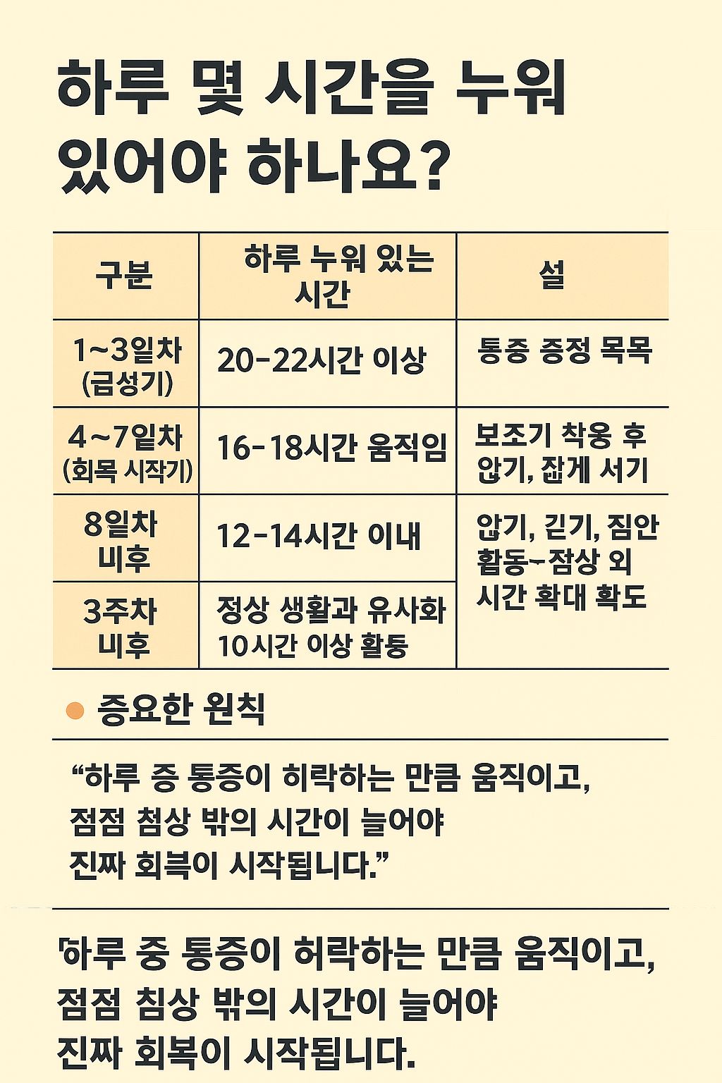 ✔️ 하루 2~3시간씩 점진적으로 앉기·서기·짧은 걷기를 시작해야