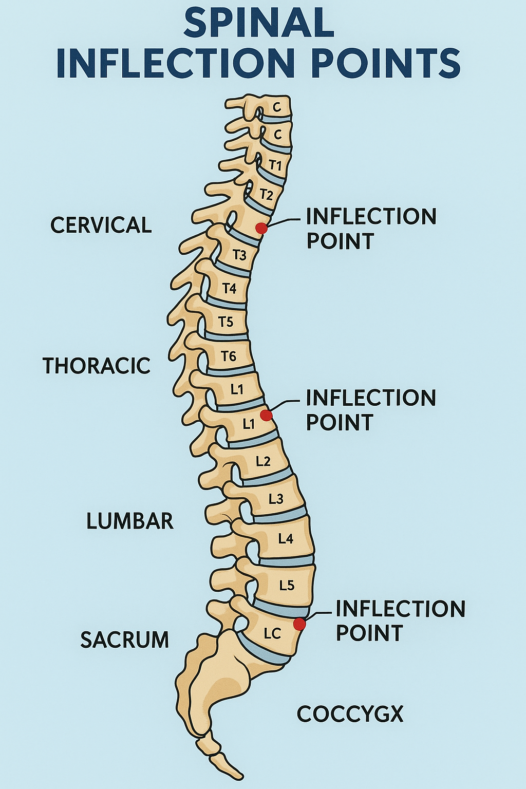 여기서 말하는 ‘변곡점’은 곡선의 방향이 바뀌는 지점, 즉 만곡이 전만에서 후만으로 또는 후만에서 전만으로 바뀌는 위치를 의미합니다.