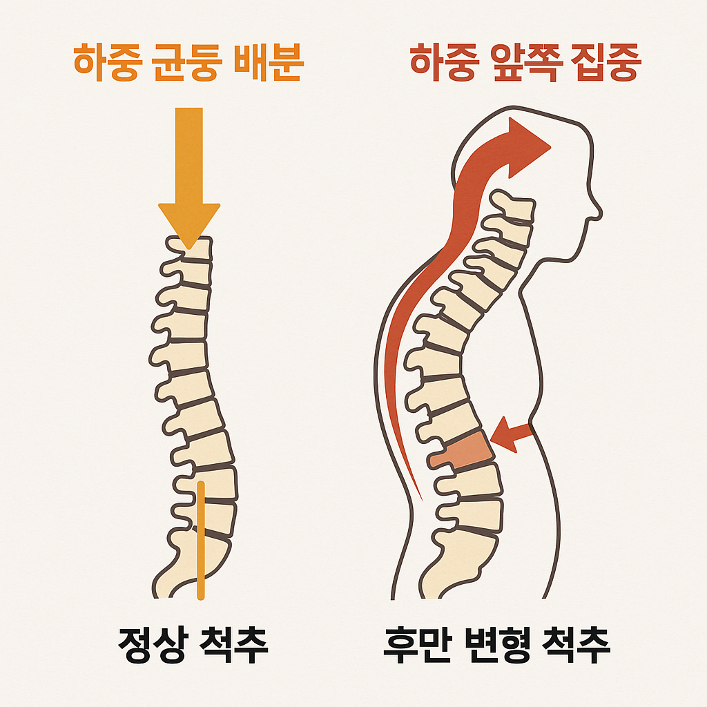 “골절된 부위가 무너져 굽은 자세(후만)가 남을 때 척추 전체의 하중이 어떻게 달라지는지”를 조금 더 해부학적·역학적으로 풀면 이렇게 설명할 수 있습니다.