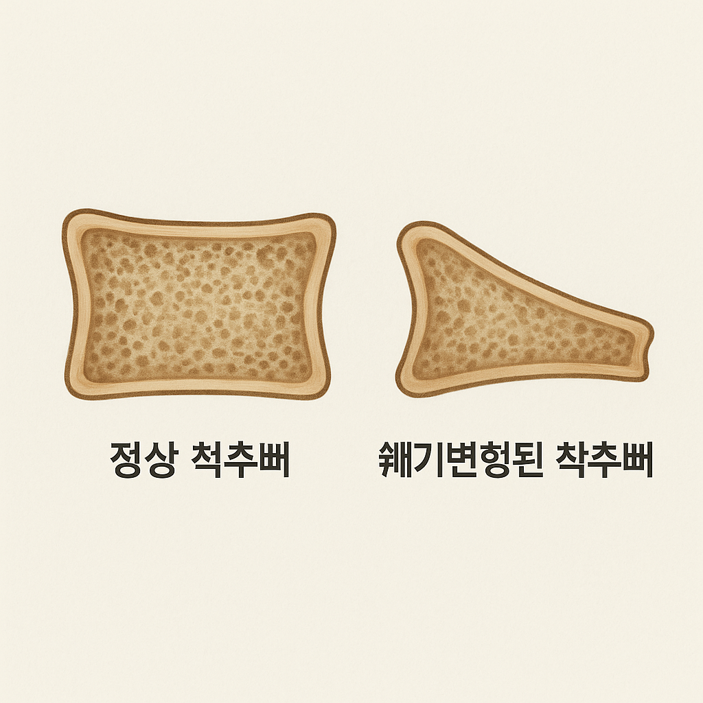 압박골절 후 변형이 남은 상태로 일상생활을 하면, 이 해면골에 미세 균열이 반복 → 작은 충격에도 쉽게 추가 손상이 발생합니다.