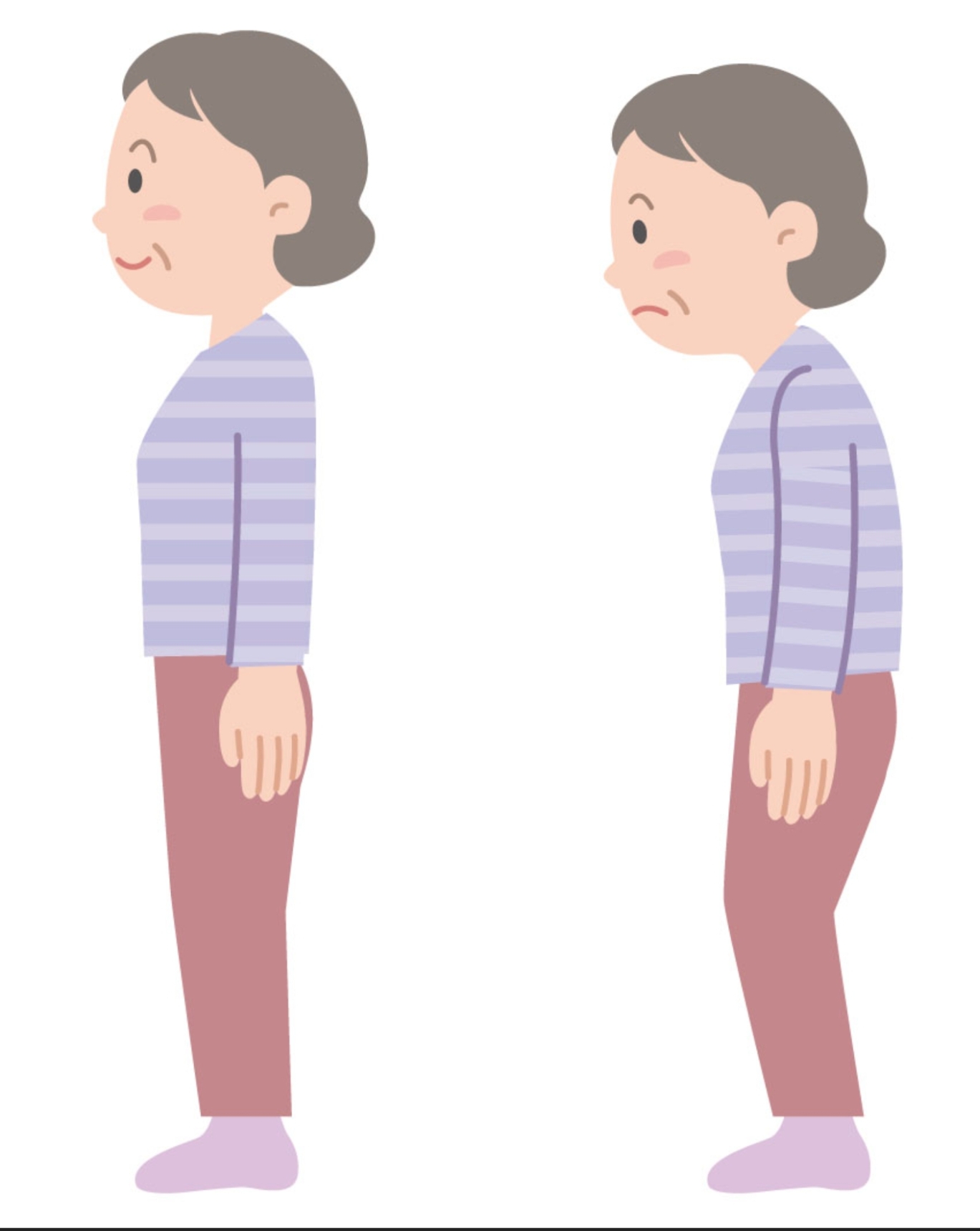 압박골절 후 척추체가 찌그러지면, 몸통의 균형축이 앞쪽으로 치우칩니다.