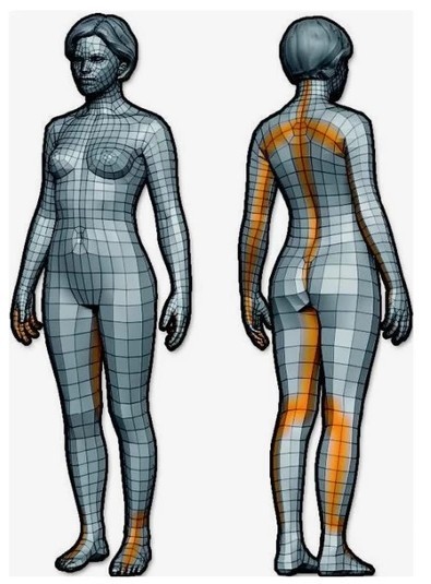 목, 어깨, 복부, 등, 골반, 팔, 다리, 발