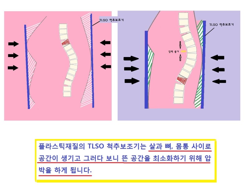 가장 중요한 것이 골절된 부위의 뼈와 뼈들의 받혀줌과 지지력인데... 플라스틱재질의 TLSO 척추보조기는 살과 뼈, 몸통 사이로 공간이 생기고 그러다 보니 뜬 공간을 최소화하기 위해 압박을 하게 됩니다.