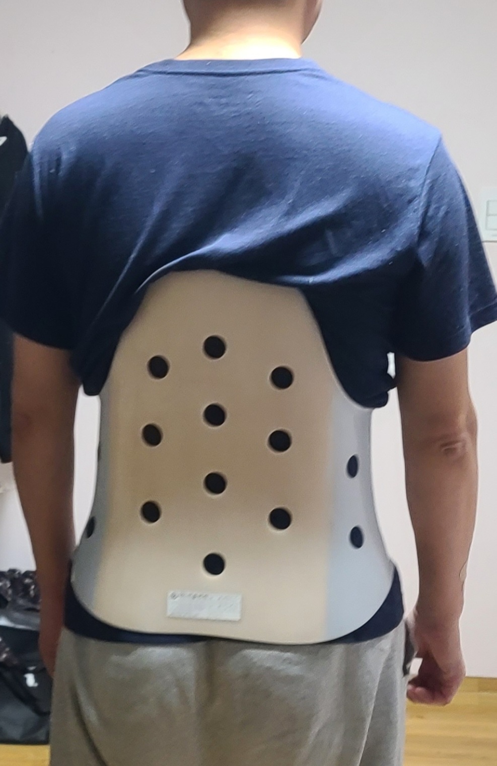 골절된 부위를 스피노메드의 부목이 정확하게 받혀주고 척추뼈 전체를 기립, 익스텐션 시켜주어 척추의 압력을 감소시켜주는 것입니다.